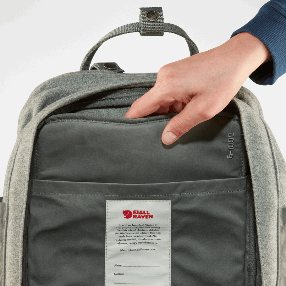 Kånken Re-wool Laptop Er En Spesialversjon Av Kånken, Laget Av Resirkulert Ull Med Et Polstret Laptoprom. Ved Bruk Av Tradisjonelle Metoder Blir Søl Fra Ulltekstilindustrien Forvandlet Til Et Meltonstoff Av Høy Kvalitet. Bakpanelet, Bunnen, Lommene Og Fôret Er Alle I G-1000 Heavyduty Eco S, Det Samme Er De Polstrede Skulderstroppene Og Seteputen.